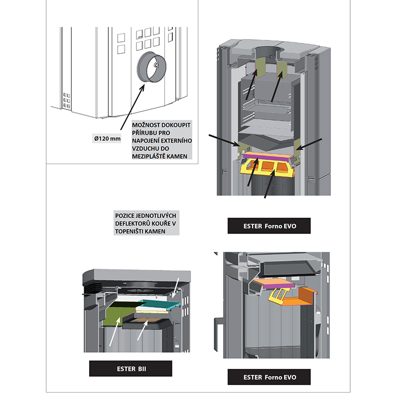| Externí přívod vzduchu | Ano, jako příslušenství 120 mm (do mezipláště kamen) |