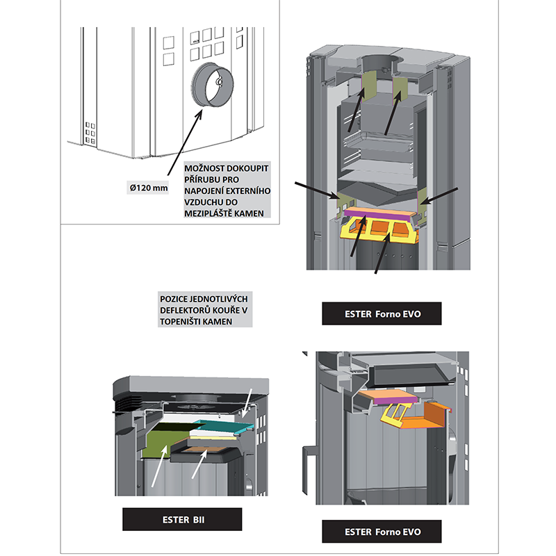 | Externí přívod vzduchu | Ano, jako příslušenství 120 mm (do mezipláště kamen) |