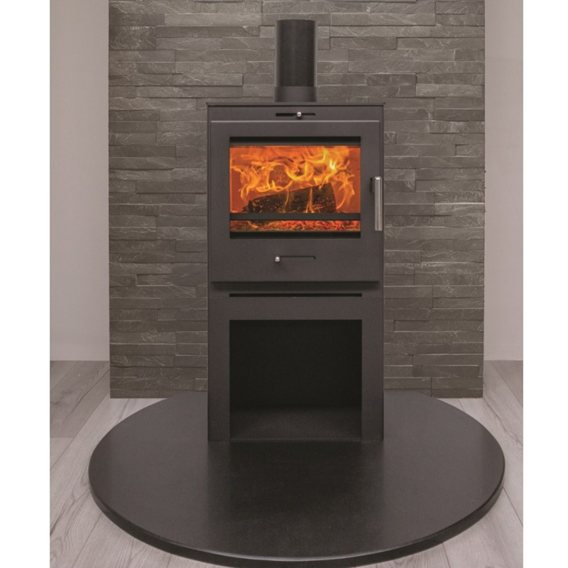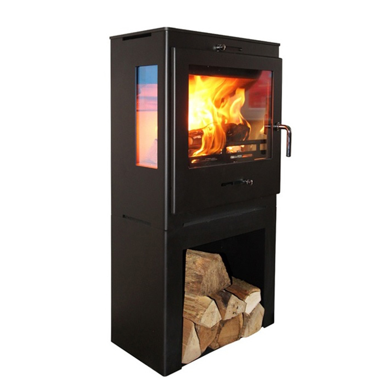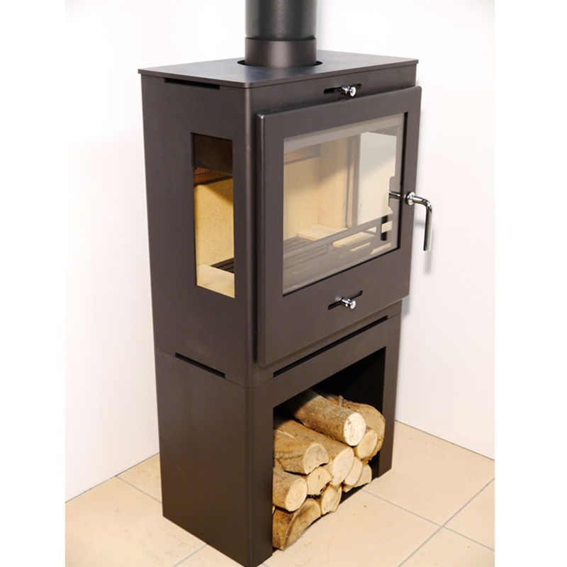 Krbová kamna Hede 1D panorama s dřevníkem a úzkou konstrukcí která nezabere prostor. Krbová kamna Hede s nerezovou chladnější kličkou.