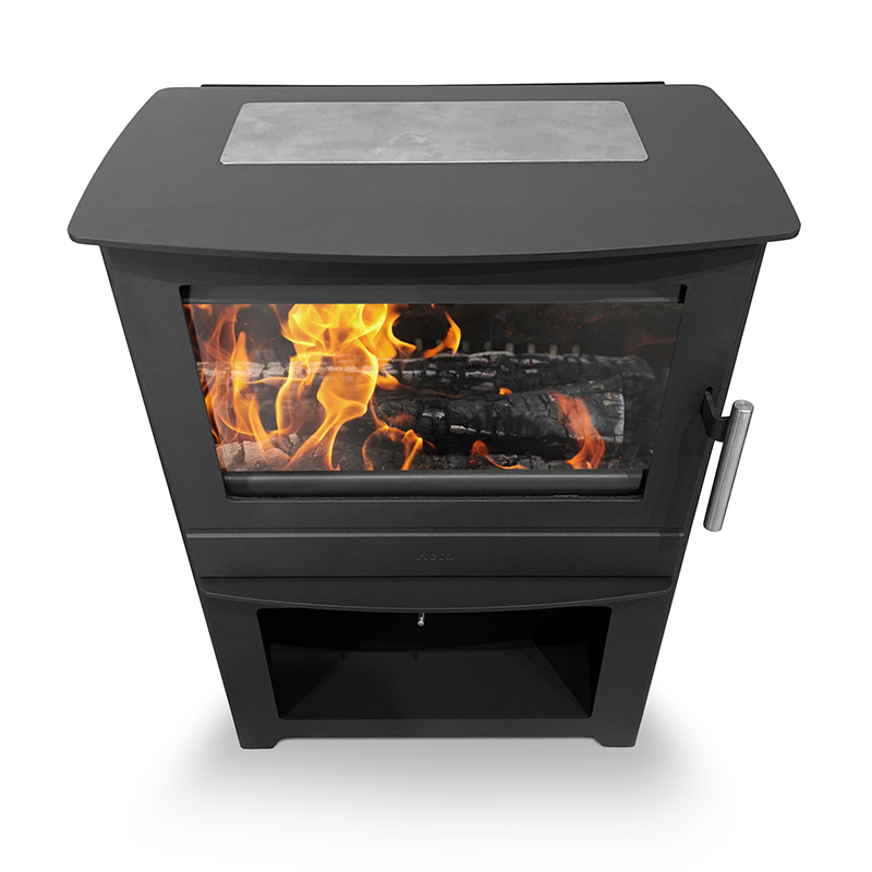 Krbová kamna Heta Inspire 55H K je verze s litinovou varnou plotnou a se zásobníkem na dřevo.