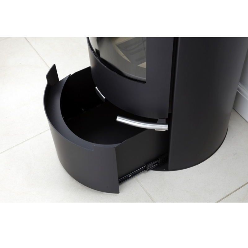 Spodní část kamen (pod spalovací komorou) tvoří velice praktický vysouvací zásobník na kolejničkách, který se používá na uskladnění několika polen, třísek, podpalovače, rukavice apod.. Prostě všech věcí, které u kamen musí být, ale není na ně zrovna hezký pohled. Díky tomuto zásobníku je máte vždy po ruce a přitom Vám "nehyzdí" interiér.