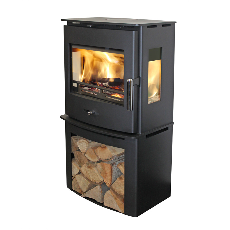 Krbová kamna Hede 4D Panorama s dřevníkem a velkým prosklením ze tří stan opatřena nepřilnavou vnitřní vrstvou, která zaručí, že skla zůstanou vždy čistá