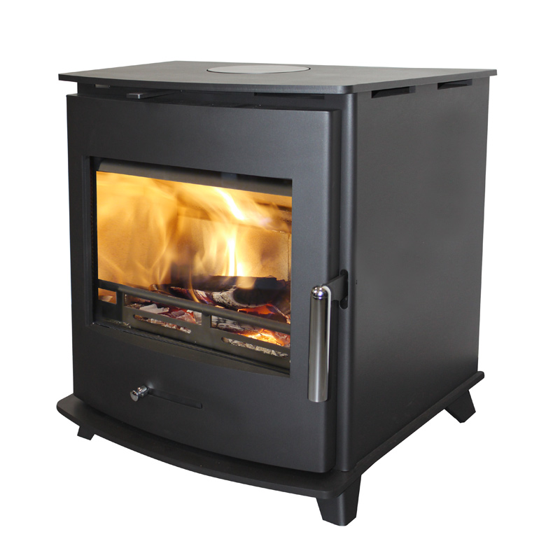 Krbová kamna Hede 5 s masivní konstrukcí. Krbová kamna Hede s chladnější nerezovou kličkou a elegantně zaoblenou čelní stranou.
