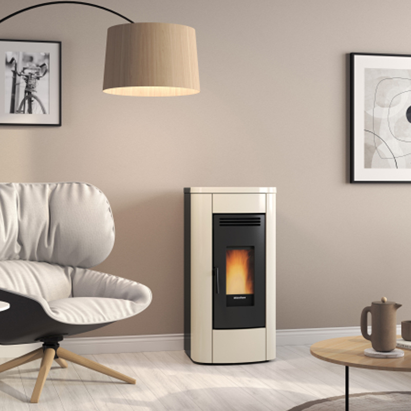 Lokální teplovzdušná kamna na pelety s automaticky regulovatelným výkonem a možností rozvodu teplého vzduchu do dalších místností. Ocelové opláštění má smaltovanou povrchovou úpravu v různých barevných odstínech. Tím je zaručena barevná i tvarová stálost obkladu. V horní části jsou kamna osazena kachlovým obkladem. Topeniště je osazeno litinovými dvířky s velkým panoramatickým prosklením. Předávání tepla je podpořeno distribučním ventilátorem, který lze modulovat pomocí integrované funkce. Tím je zaručena lepší cirkulace a rovnoměrnost tepla po místnosti a možnost rozptýlení tepla i do přilehlých místností. Litinová konstrukce spalovací komory zaručuje dlouhodobou životnost. Zásobník má kapacitu na 15 kg pelet a spotřeba paliva je od 0,7 do 1,8 kg / hod. Účinnost kamen převyšuje hranici 90 %. Součástí konstrukce je integrovaný termostat pro kontrolu a udržování nastavené teploty. Podle nastavené teploty uživatelem na displeji si kamna automaticky upravují množství přikládaných pelet a tím i samotný výkon kamen. Možnost nastavení týdenního programování zvyšuje komfort a umožňuje automatické zapínání a vypínání kamen i v případě nepřítomnosti obsluhy. Tím odpadá práce s přípravou palivového dřeva a zákazníkům je poskytnut komfortní a plně automatický provoz. Kamna se nabízí v různém barevném provedení obkladu. V ceně kamen je dálkový ovladač, který zvyšuje komfort obsluhy.